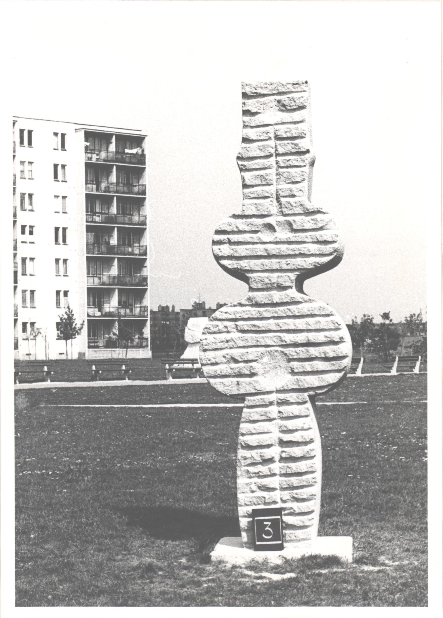 Socha Jána Hučka ml. výtvarne dotvárala vstupný areál budovy Podnikov zahraničného obchodu (PZO) na sídlisku Ostredky. Projekt budovy v roku 1969 pripravila známa trojica architektov: Ferdinand Konček, Iľja Skoček, Ľubomír Titl. V rámci sídliska budova pôsobila dominantne, slúžila administratívnym účelom, obchodným rokovaniam viacerých bývalých socialistických podnikov (Chemapol, Drevounia). Socha sa nachádzala na ľavej strane od vstupného centrálneho schodiska. Jej organické tvaroslovie tvorilo zaujímavý kontrapunkt k racionálnej funkcionalistickej stavbe, v ktorej dominovali horizontálne línie a chladná geometria. Kompozíciu z liateho betónu rozohrávala skladba konkávnych a konvexných tvarov. Mala nepravidelnú formu, kombinovanú z kruhových a obdĺžnikových častí, vzájomne do seba previazaných. Z jednej strany prevládala plošnosť a z bočnej – zvlnená elegantná silueta. Z čelnej strany vyrastal centrálne umiestnený polguľovitý detail, ktorý tvoril ústredný bod kompozície. Abstraktná kompozícia pracovala so súhrou protichodných tvarov a síl medzi nimi, pôsobila pritom harmonicky až meditatívne. Osadená bola zároveň s dokončením stavby v roku 1972 a zničili ju spolu s ďalšími sochárskymi realizáciami v rámci akcie odstraňovania ideologicky nevhodných sôch v roku 1976. Ján Hučko mladší (1937) sa neskôr už abstraktnému jazyku v sochárstve nevenoval, z neskoršieho obdobia sú známe iba angažované realizácie v intenciách socialistického realizmu. Aj z toho dôvodu je škoda, že realizácia musela byť na príkaz miestnych orgánov zničená a zostala zachovaná iba na fotografiách.