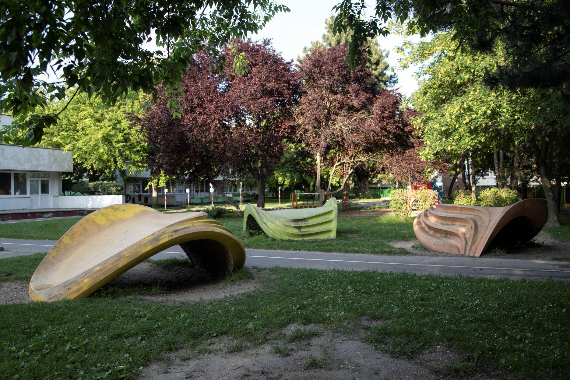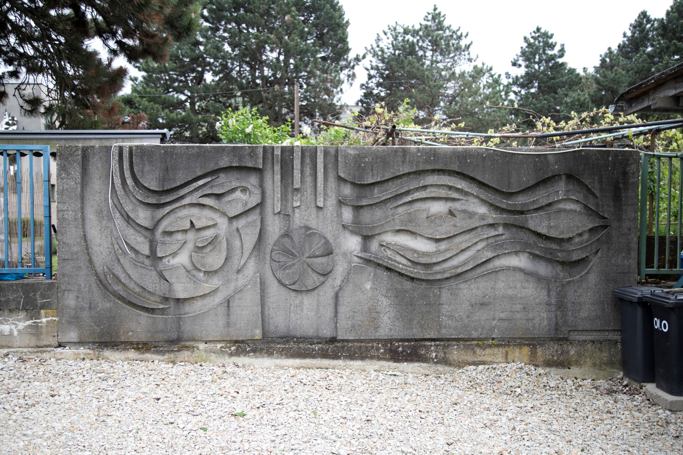 Dekoratívny monumentálny reliéf z „nerezu“ (antikora, nehrdzavejúcej ocele) sa nachádza na čelnej fasáde prečerpávacej stanice. Je situovaný v pravej časti fasády v blízkosti nárožia a prechádza cez dve podlažia budovy. Vertikálne komponovaný reliéf je svojím námetom inšpirovaný prúdením vody a symbolicky ilustruje funkciu budovy. Spodnou časťou reliéfu prechádza centrálna os, na oboch jej stranách smerom do priestoru expandujú mäkko modelované organické tvary, evokujúce vlny na vodnej hladine. Línia strednej osi vrcholí troma kruhovými laločnatými útvarmi, pravidelne rozdelenými na päť častí. Predstavujú vodné turbíny, okolo ktorých v dynamickom kruhovom pohybe prúdi voda. Spodná ružica turbíny je najväčšia a jej časti výraznejšie vystupujú do priestoru, stredná ružica je menšia, jej stred tvorí päťcípa hviezda, priama alúzia na komunistickú ikonografiu, a za ňou je ešte umiestená tretia ružica, ktorá je najmenšia a takmer prekrytá. Vlny v hornej časti sú zachytené v expresívnom pohybe, prekrývajú sa a ich ukončenia sú ostro rezané do tenkých hrotov smerujúcich hore. Plošne pôsobiaci reliéf je zložený z viacerých častí, vyrezaných z tenkého nerezového plechu, ktoré sú komponované v rozličnej výške, a tak sa dynamicky prekrývajú. Autorkou diela je akademická maliarka Mária Podhradská-Miková (*1943), ktorá navrhla aj reliéfne stvárnený oceľobetónový plot situovaný pri vstupe do areálu.